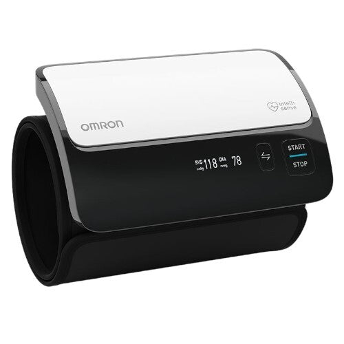 Sleek and Compact one-piece design takes clinically-accurate readings anywhere anytime without awkward wires or hoses * Simple intuitive controls allow for no-hassle set up and easy use time and time again * Bluetooth© technology allows you to sync your readings to your smartphone via the OMRON Connect mobile app o you can monitor your trends and share your readings with family or a healthcare provider (can be used without a smart device) * Wide-Range Cuff fits standard to large adult upper arms 9 to 17 in circumference * Uses an exclusive heart health algorithm Advanced Accuracy * It measures more data points and eliminates interference from movement for more precise clinically-accurate readings * Unit operates on 4 AAA batteries (included) * Dimensions (approx.) Height: 4.63 Width: 3.5 Depth: 1 Weight: 8.5 oz. * Limited Warranty for 5 years *